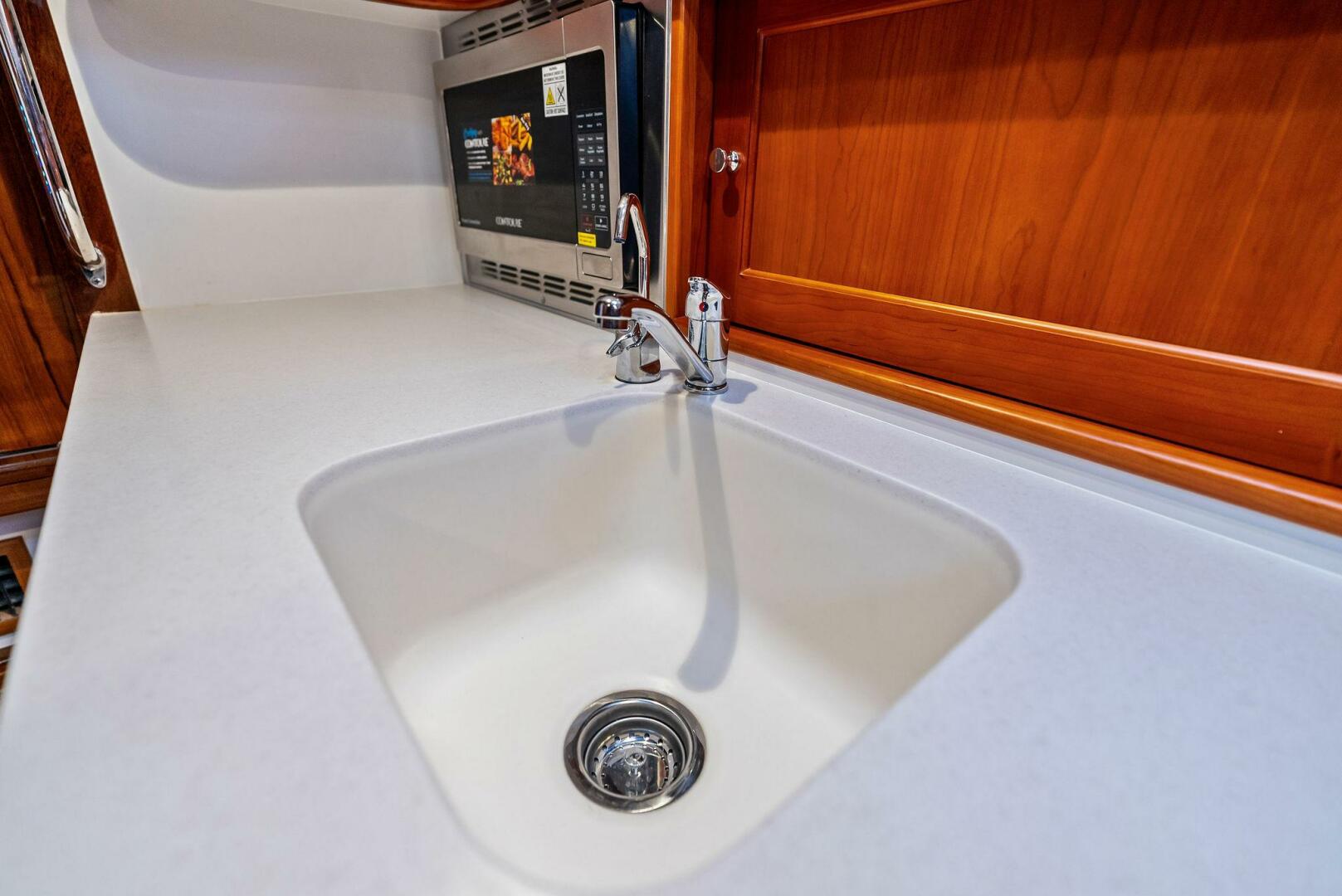 - Enclosed head and shower to starboard with Corian countertop, sink, vanity cabinets, and drawers