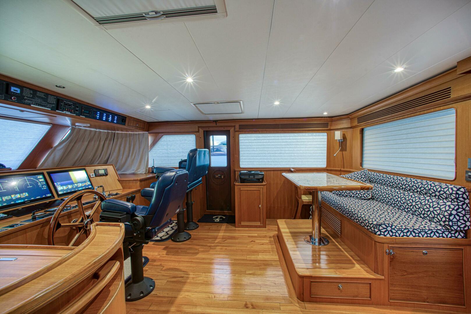 The fully enclosed Command Bridge has the same interior finishes as the rest of the yacht with Teak and Holly floors, and satin teak cabinetry and walls. The area can be opened well-ventilated on nice days by opening the port and starboard command bridge doors, aft door and large overhead hatches. The helm area is beautifully done with all the yachts systems at your fingertips. The captains Stidd Helm chair is accompanied by a double chair to starboard. The captain has access to all the systems on the overhead display panel. This provides the ability to quickly see all warnings, tank levels, voltage levels. To starboard there is an electrical sub panel that provides access to the main breakers that are related to the operation of the yacht. The main display screens are 3 22” Garmin Multifunction displays. The CAT engines have their own displays.