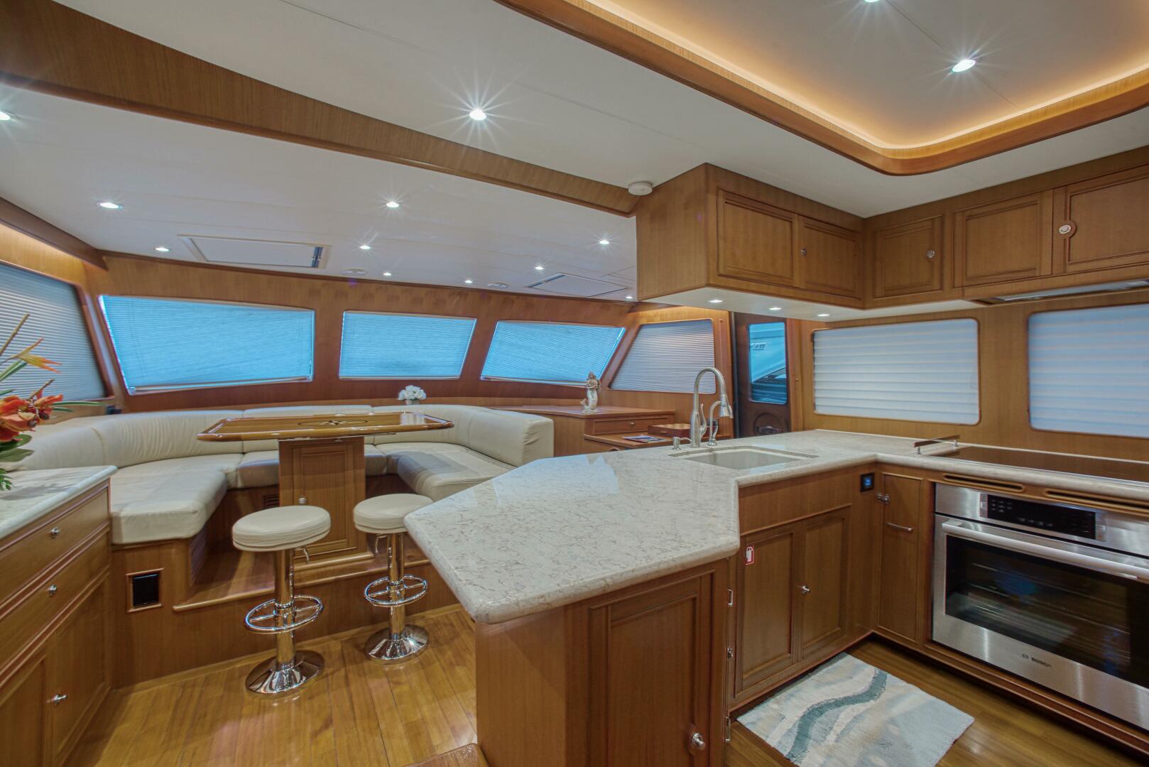 Walking up three steps brings you to the spacious, modified, u-shaped galley, featuring numerous upgrades including Dupont Zodiaq countertops, a stainless-steel Franke sink with a cutting board cover, Grohe faucets, and a garbage disposal. The galley is equipped with a full suite of appliances: a stovetop, electric range with full size oven, oversize convection microwave, and full height subzero refrigerator in the galley and two sub-zero freezer drawers forward. Ample cabinetry and drawer space ensure that everything you need is within reach. This open, well-appointed galley is perfect for entertaining, and gourmet chefs will thrive in its functional and elegant design. Located forward of the galley, the dining area is designed to seat 6-8 comfortably around a large U-shaped dinette. Surrounding the dining space are expansive windows constructed from laminated double-layer tempered glass, offering superior hurricane and weather resistance while enhancing physical security and maintaining watertight integrity. The 360-degree views from this elevated position are simply stunning.