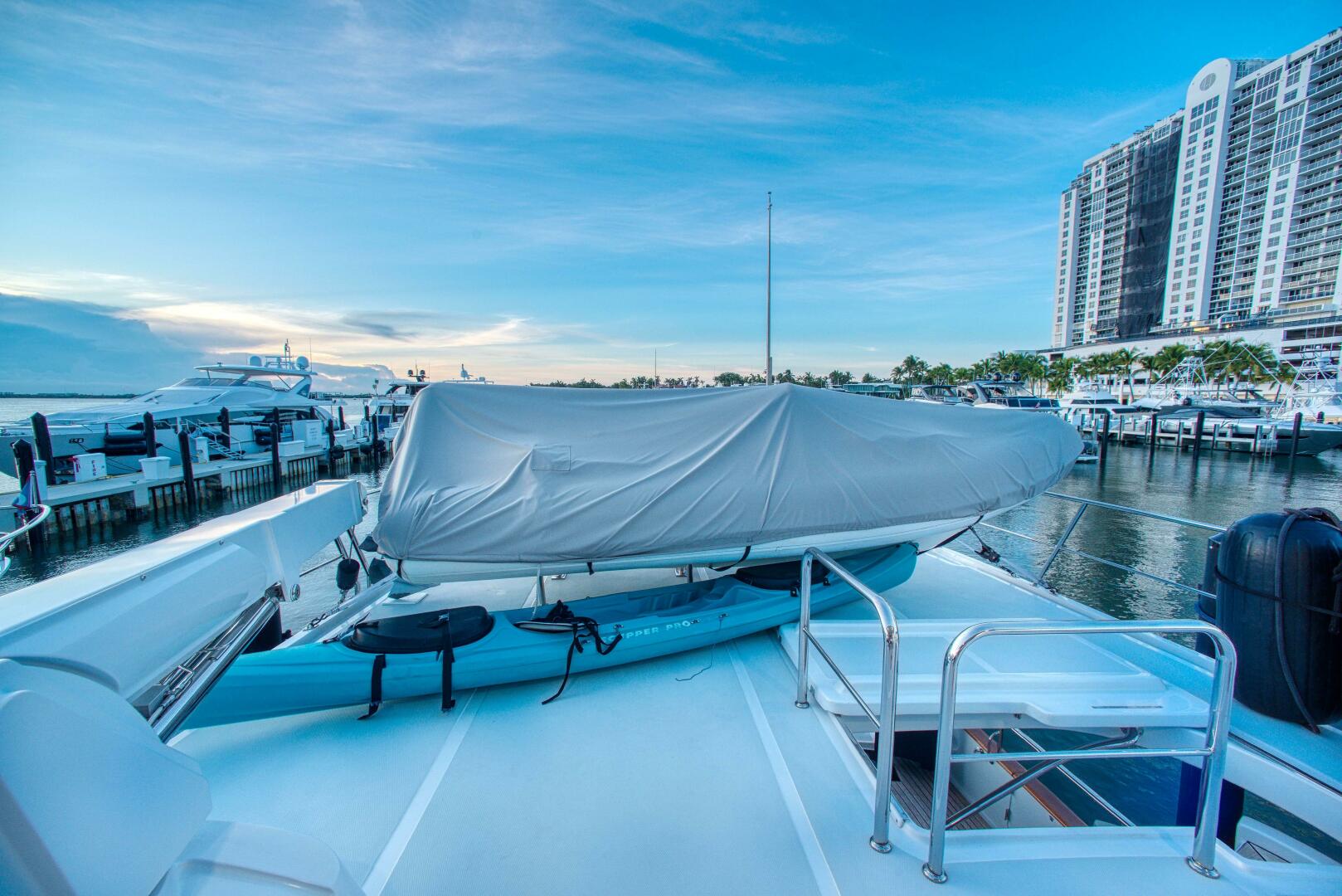 Boarding is easy and flexible: enter from the stern via the port side stairway connected to the large swim platform or via the Marquip stairs at one of the 4 boarding locations on the side deck. The swim platform itself is expansive, ideal for water activities or relaxed lounging. A large, hydraulically assisted transom door provides access to the lazarette, crew quarters, and engine room.