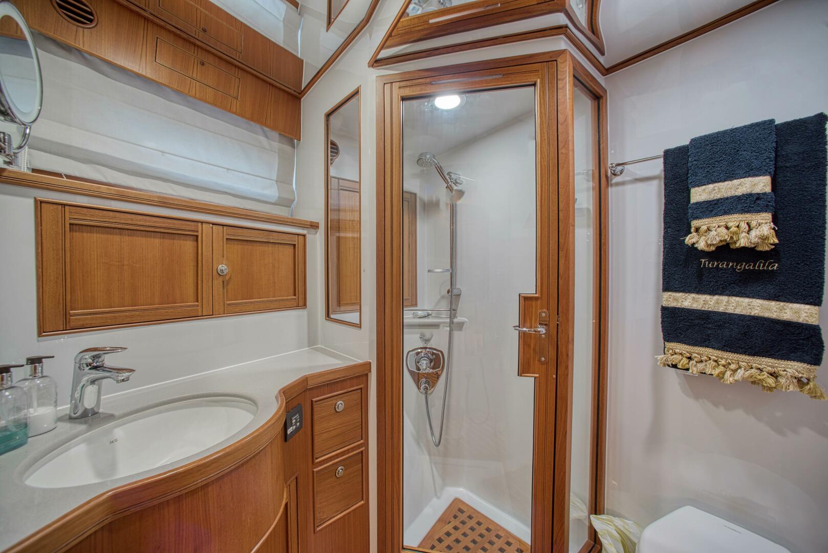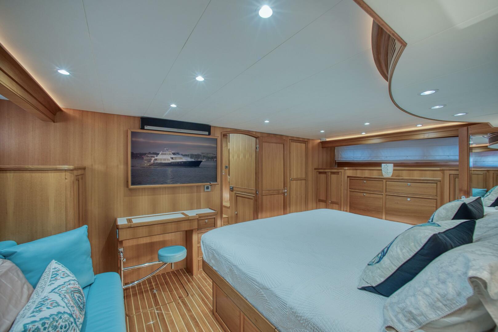The full-beam master stateroom provides a spacious and private retreat, complete with a king-size berth positioned centerline. The head is aft and entered on the starboard side and has a large countertop and twin sinks. The shower is very large. On the port side you find the entrance to the walk-in closet. Hanging lockers on both port and starboard sides, along with abundant drawer storage that offers excellent organization. Large portlights on either side bring in natural light and ocean views, enhancing the open and airy feel of the space. Luxurious touches include rich wood accents, custom furnishings, a built-in settee, and premium fixtures. The ensuite head features a large shower, granite countertops, Grohe fixtures, and an electric push-button toilet.
