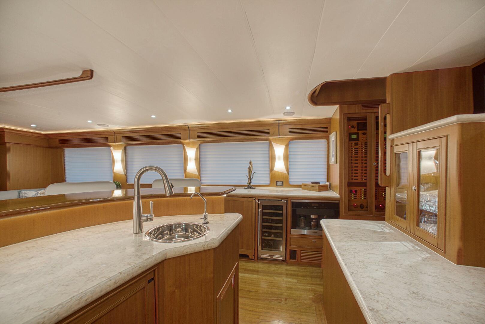 On the port side by the table is large storage cabinet with a granite top. This is a perfect serving area with close proximity to the pilothouse table. Additional storage can be found directly across the pilothouse outboard of the stairs.