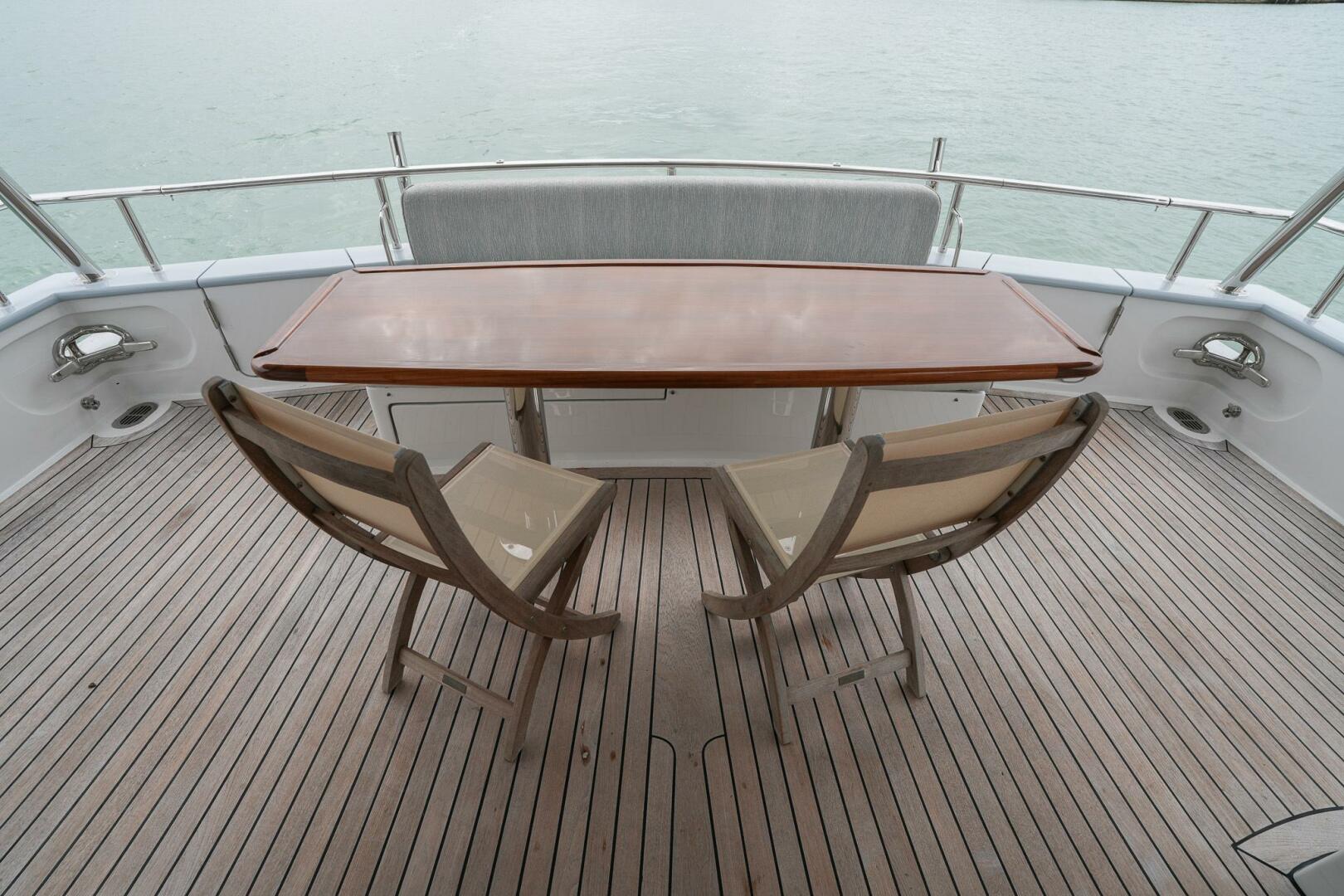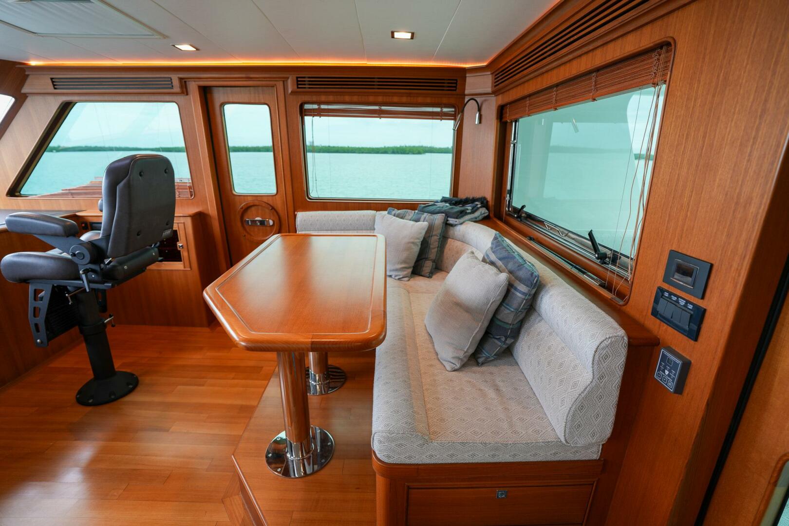 It is always a great day in the command bridge. With a drink fridge, ice maker, and a day head a few steps away, it is very comfortable running long days. This is the preferred area for passengers when underway with panoramic views of the ocean and waterways. In addition, the helm offers a grand living space separate from the main deck level, making her a more private space for yacht owners who spend months at a time on board. She features two beautiful Stidd helm chairs, full Garmin electronics package, large L-shaped settee with beautiful teak table, beverage combination, and refrigerator with ice maker. This area is accessible by stairs from the pilothouse and from the aft cockpit stairs. She boasts plenty of storage and space for entertaining family and guests.