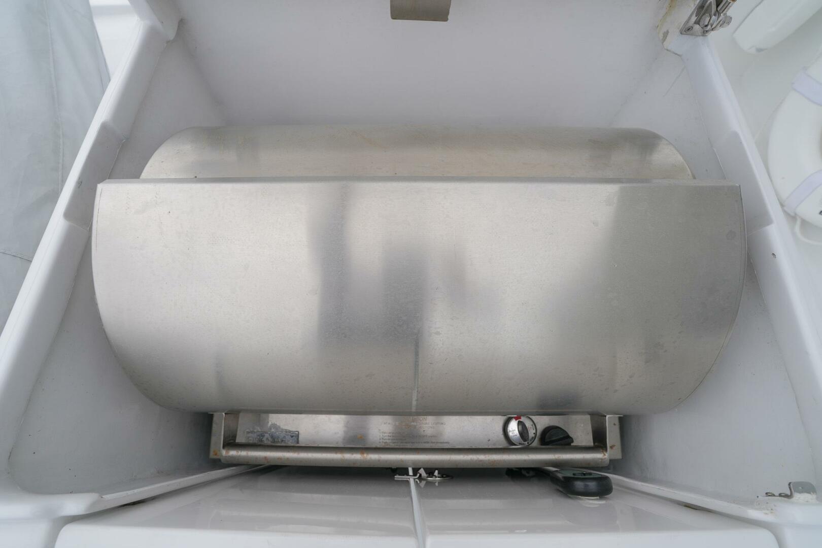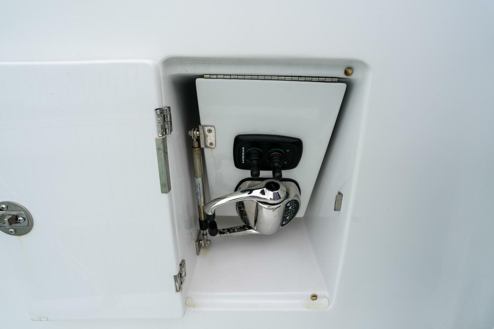 - Storage cabinet with engine controls, bow and thruster controls, and sink