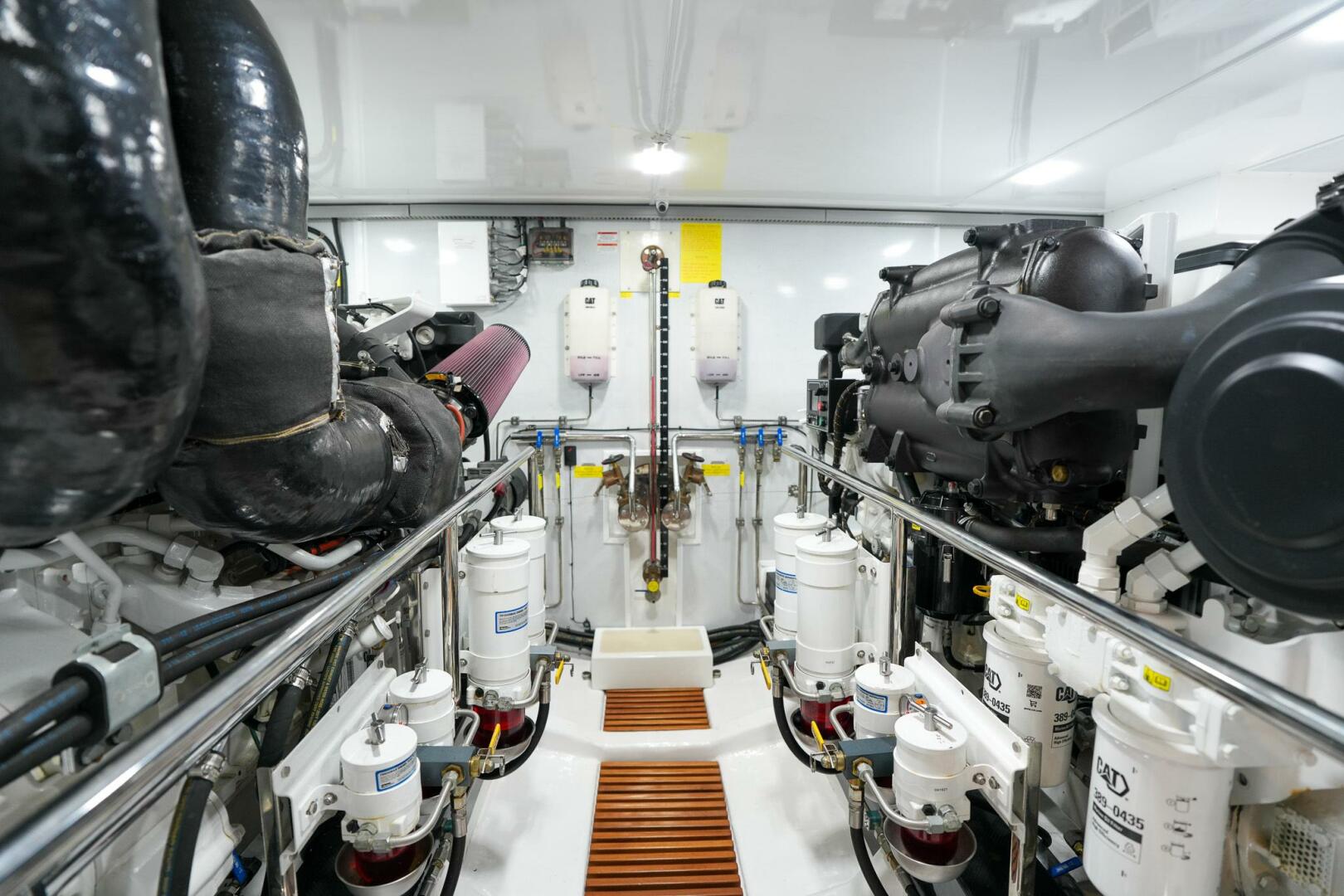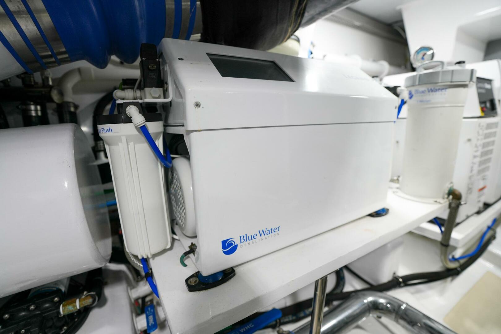 The full size “standup” engine room area offers incredibly easy access to all equipment, engines, and systems which provide excellent lighting and is air-conditioned for comfort and convenience when inspecting and on performing maintenance. This engine room is very spacious and both outboard sides can be easily reached. Upgraded and redundant Onan 21.5KW generators is perfect for the long range cruiser. Many Marlow owners visit New England in the summer and perhaps the Bahamas in the winter. Rambler is perfect for long periods of at anchor living. There are 2 strategically placed entry positions to the engine room and crew quarters. One is exceptionally easy to access from a hydraulically activated hatch built into the cockpit seat. This is the "At Sea" entrance. This yacht also features a large transom door that opens to access the Beach Club. This is perfect for getting to beach chairs and related equipment when not running.