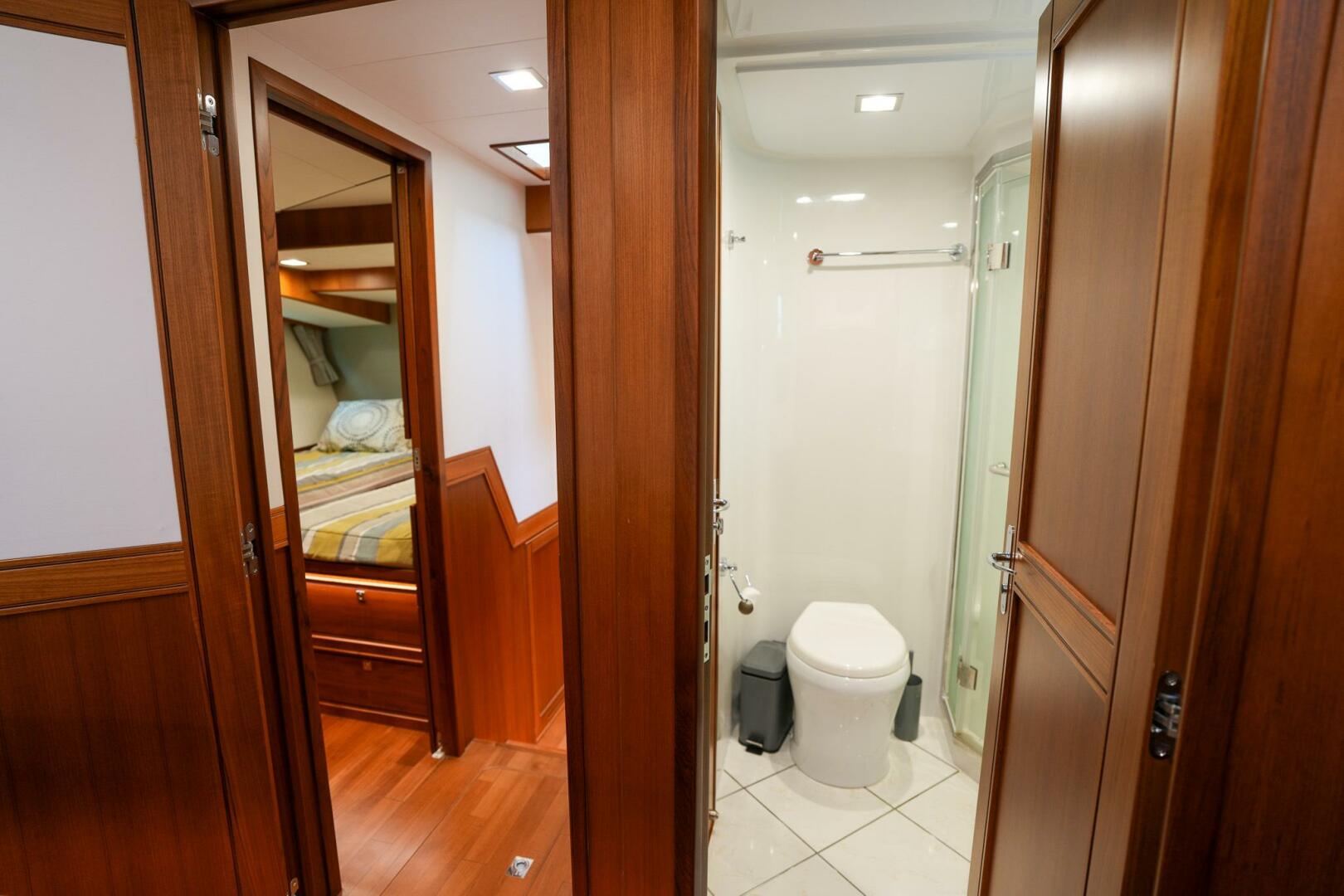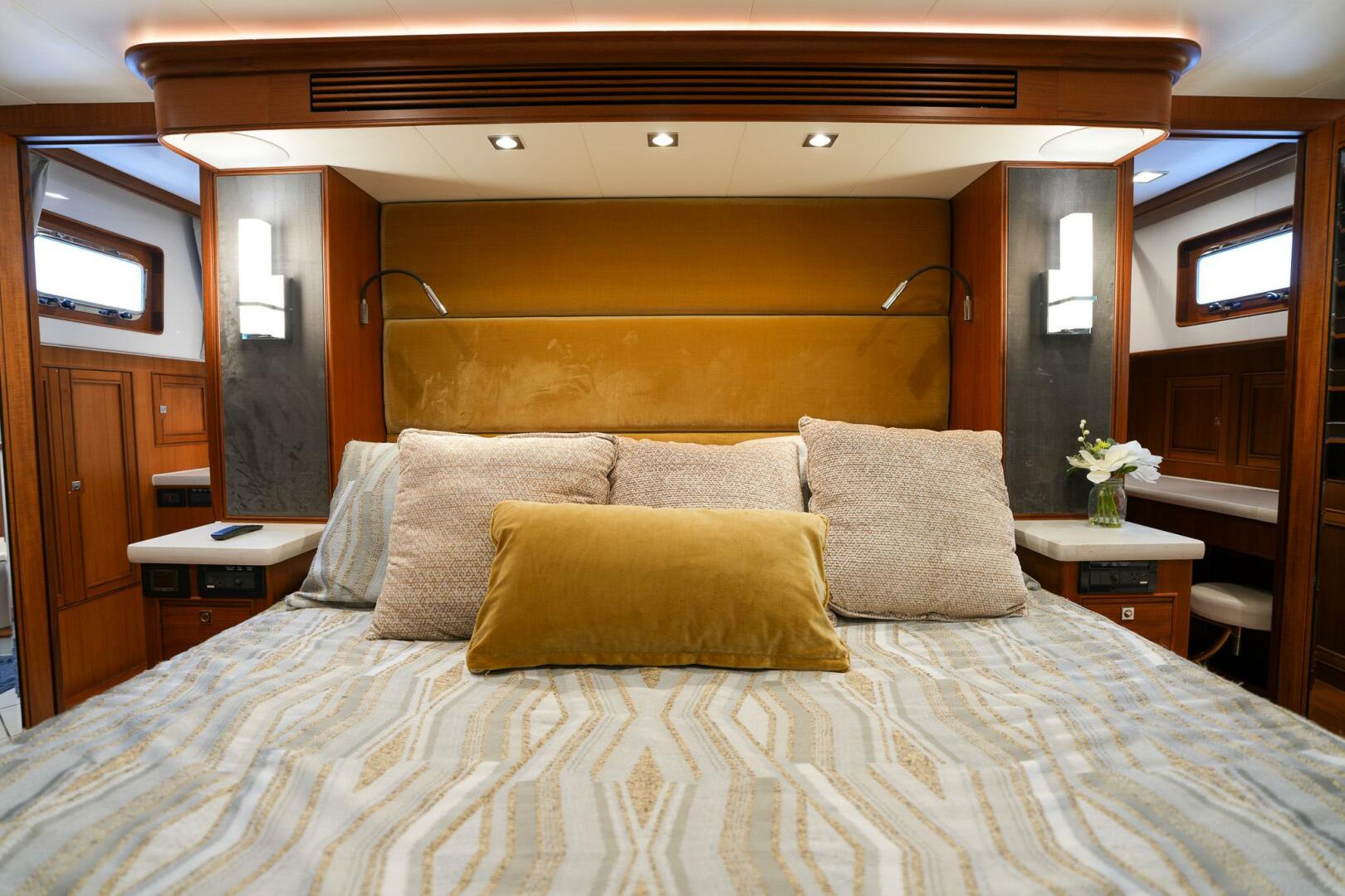 Upon entering this master stateroom, one walks through the gorgeous double doors. This specially designed extra- large full beam master suite has a custom king size bed which lies center-line with its large head and oversize head to starboard and a walk-in closet with vanity to port.