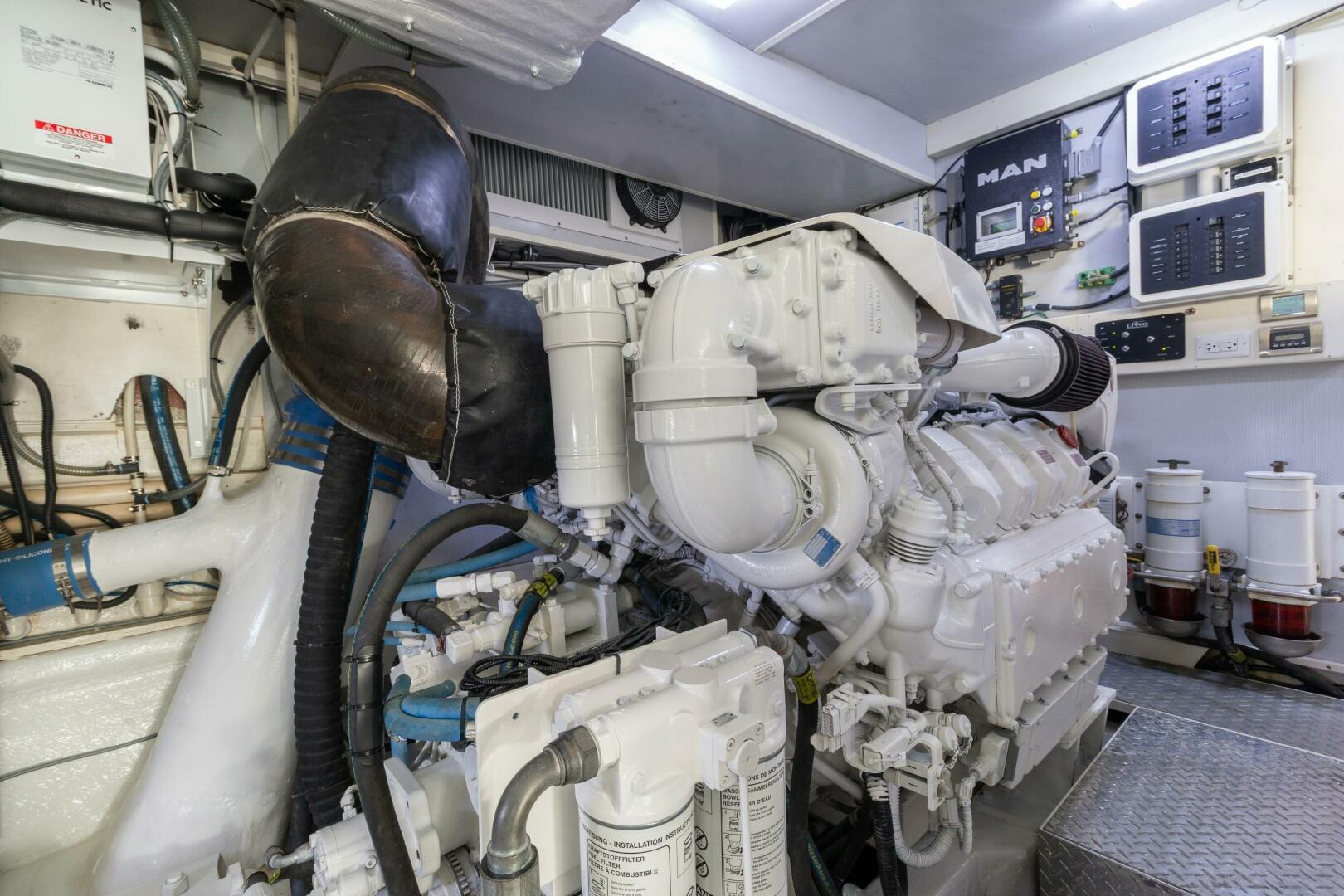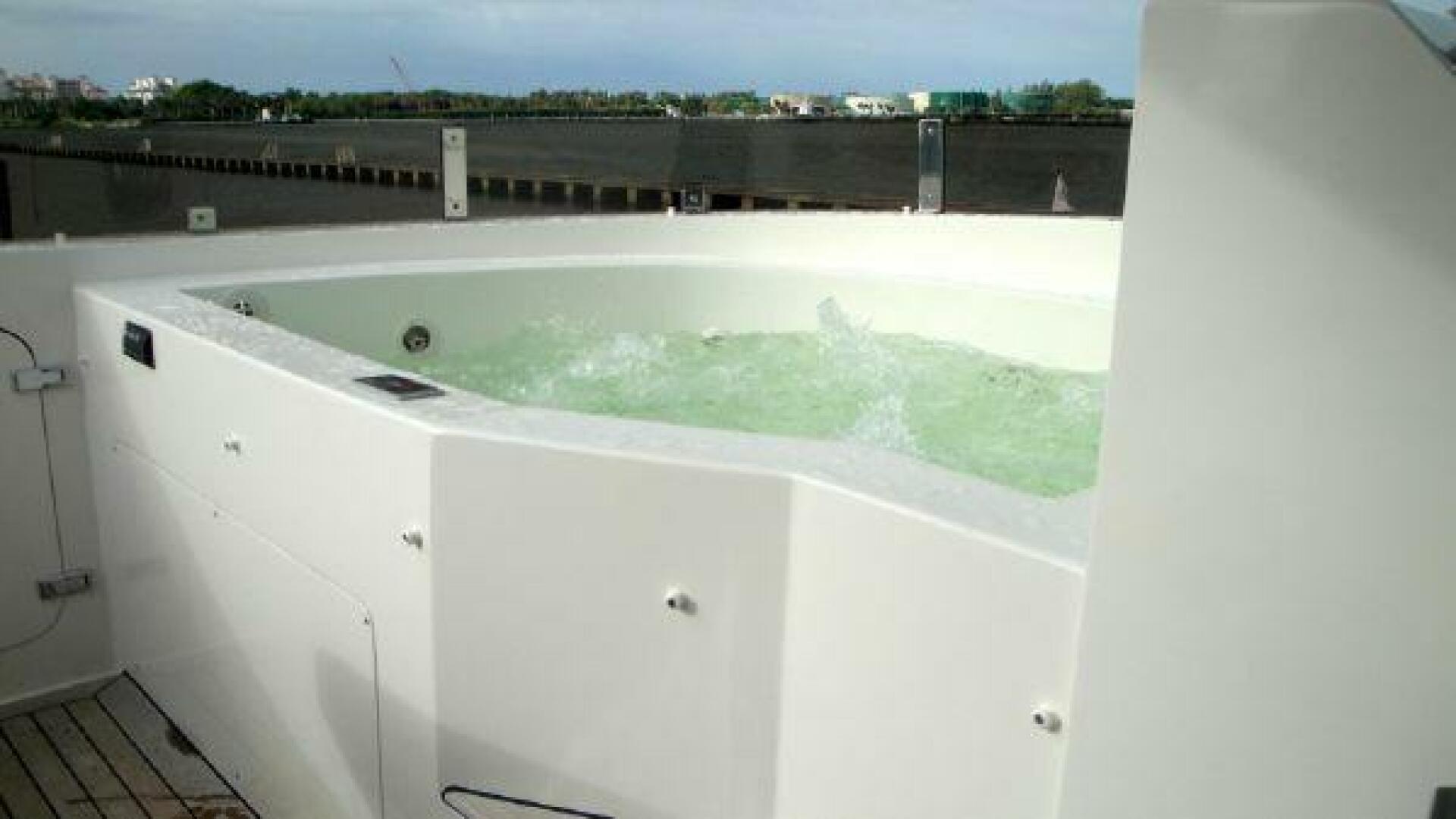 Her fully air-conditioned flybridge is perfect for entertaining, featuring a hot tub, gas grill, wet bar, and a custom crane for a scooter or jet ski—ideal for fun at anchor.