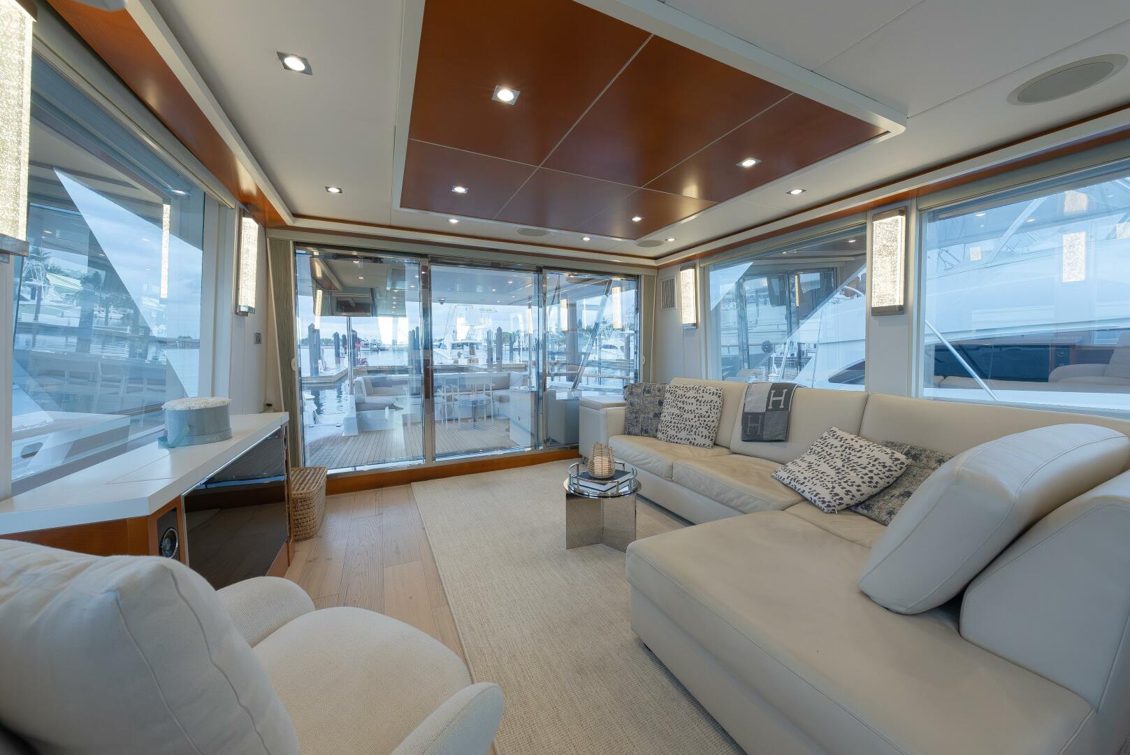 The open, Mediterranean-style aft deck offers an inviting setting for alfresco dining and lounging, highlighted by a built-in centerline settee that comfortably accommodates up to eight guests. An automatic electric glass door opens the aft deck to the salon, seamlessly combining the two spaces into an expansive area ideal for entertaining.