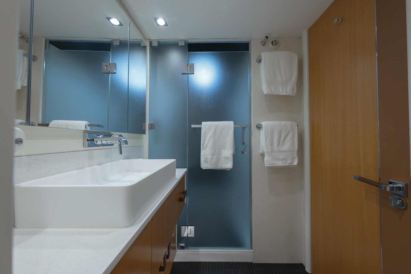The private en-suite head is accessed aft on the starboard side of the cabin. Modern and richly appointed, it features a glass-enclosed shower, separate sink, Headhunter toilet, and bidet. Excellent storage is provided throughout the cabinetry.