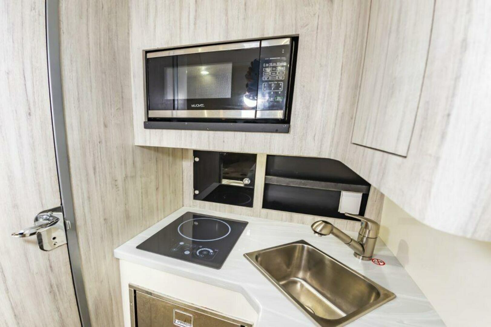 - Actuated table that converts to a sun pad or completely stows into the deck